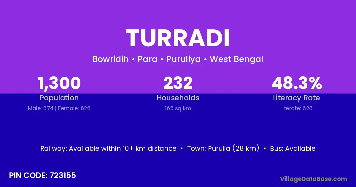 Purulia (28 km) is the nearest town to Turradi village for major economic activities and is located approximately 28 km away.
