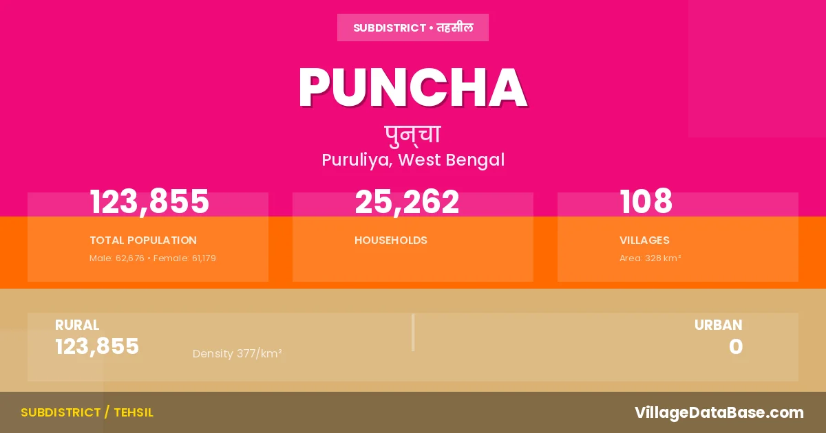Puncha Subdivision comprises about 108 villages. Below is a list of these villages along with information about their respective gram panchayats and the nearest town: