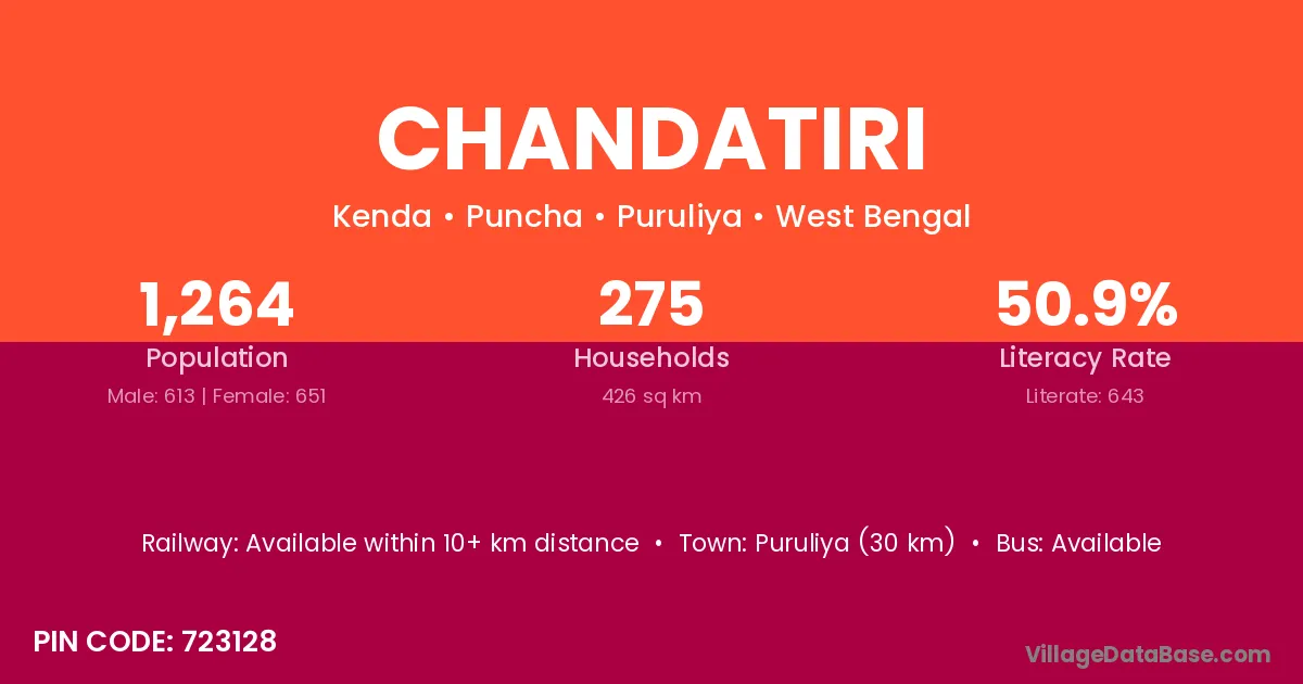 Puruliya (30 km) is the nearest town to Chandatiri village for major economic activities and is located approximately 30 km away.