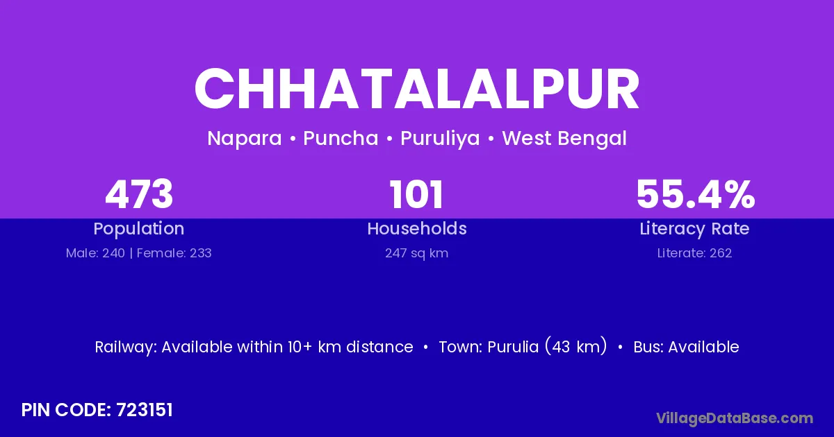 Purulia (43 km) is the nearest town to Chhatalalpur village for major economic activities and is located approximately 43 km away.