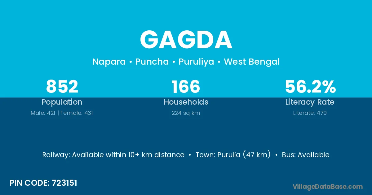 Purulia (47 km) is the nearest town to Gagda village for major economic activities and is located approximately 47 km away.