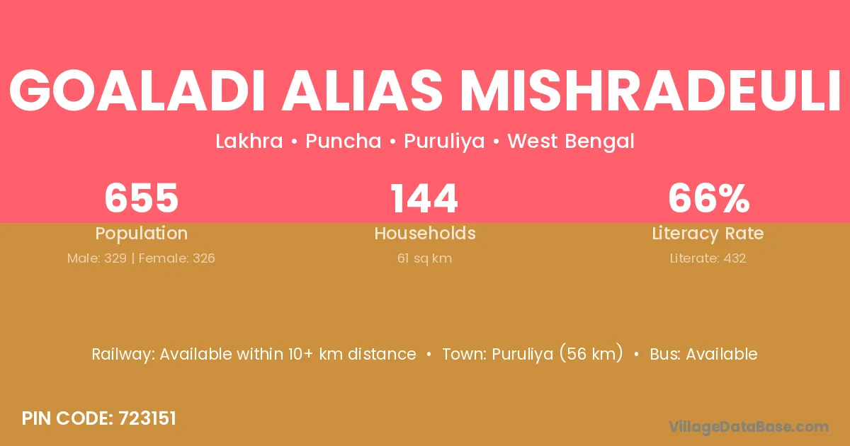 Goaladi Alias Mishradeuli village has a total population of 655 people, of which 329 are males and 326 are females.