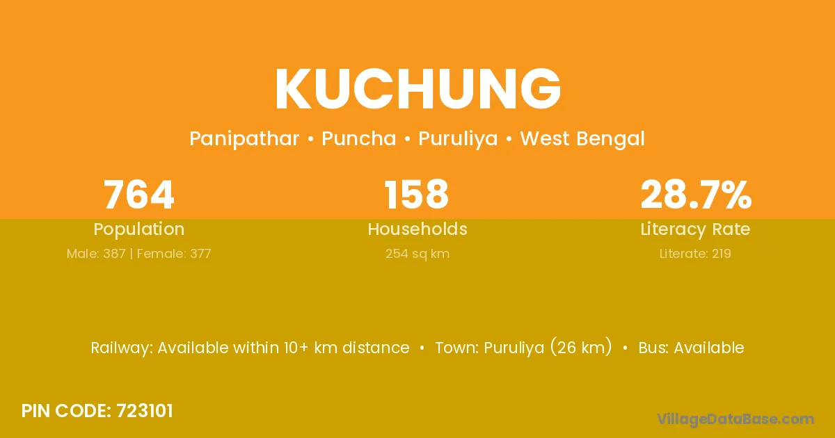 Puruliya (26 km) is the nearest town to Kuchung village for major economic activities and is located approximately 26 km away.