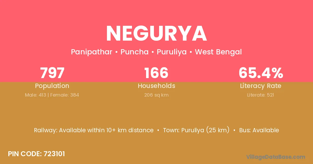 Puruliya (25 km) is the nearest town to Negurya village for major economic activities and is located approximately 25 km away.