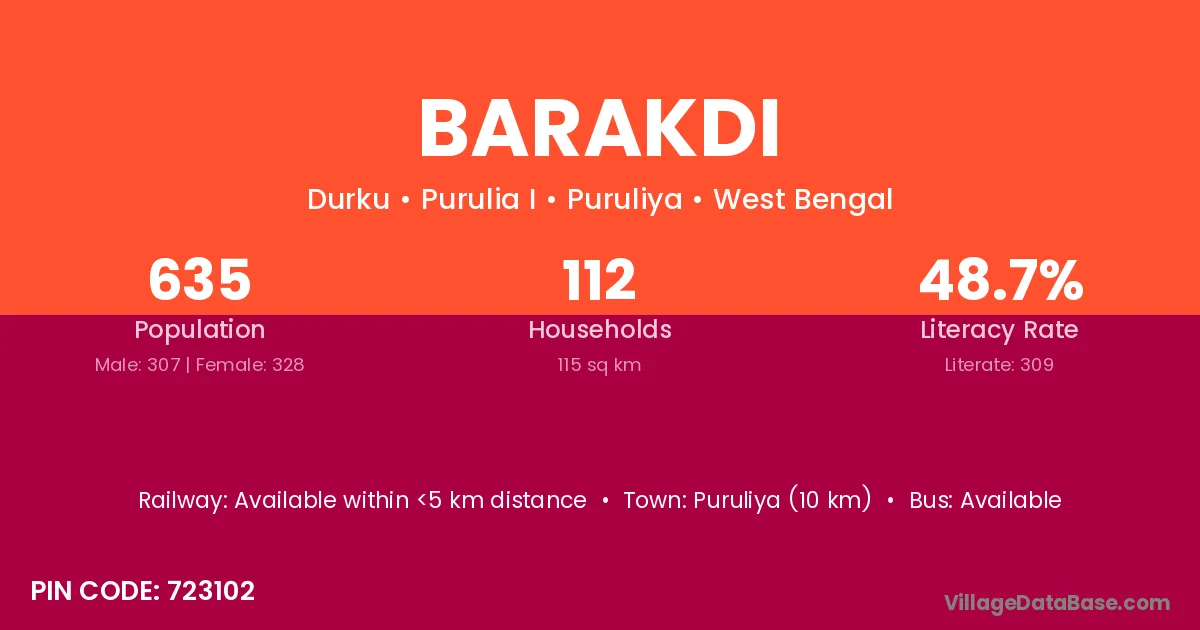 Puruliya (10 km) is the nearest town to Barakdi village for major economic activities and is located approximately 10 km away.