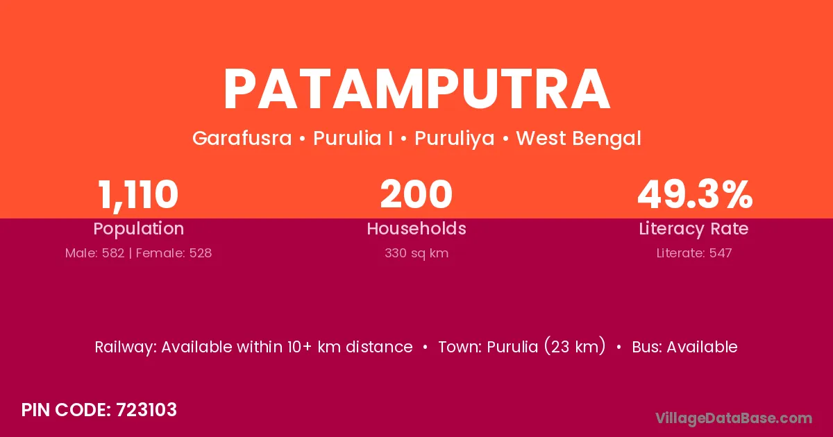 Purulia (23 km) is the nearest town to Patamputra village for major economic activities and is located approximately 23 km away.