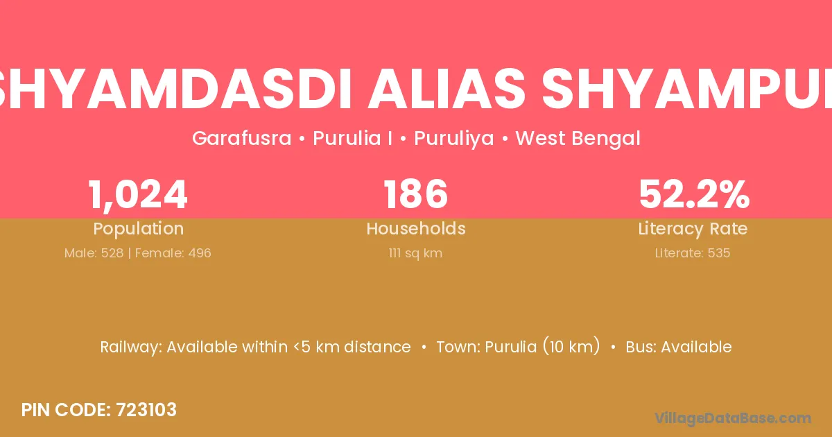 Purulia (10 km) is the nearest town to Shyamdasdi Alias Shyampur village for major economic activities and is located approximately 10 km away.