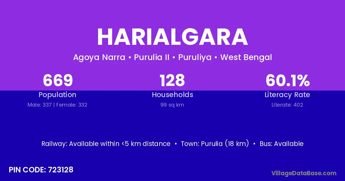 Purulia (18 km) is the nearest town to Harialgara village for major economic activities and is located approximately 18 km away.