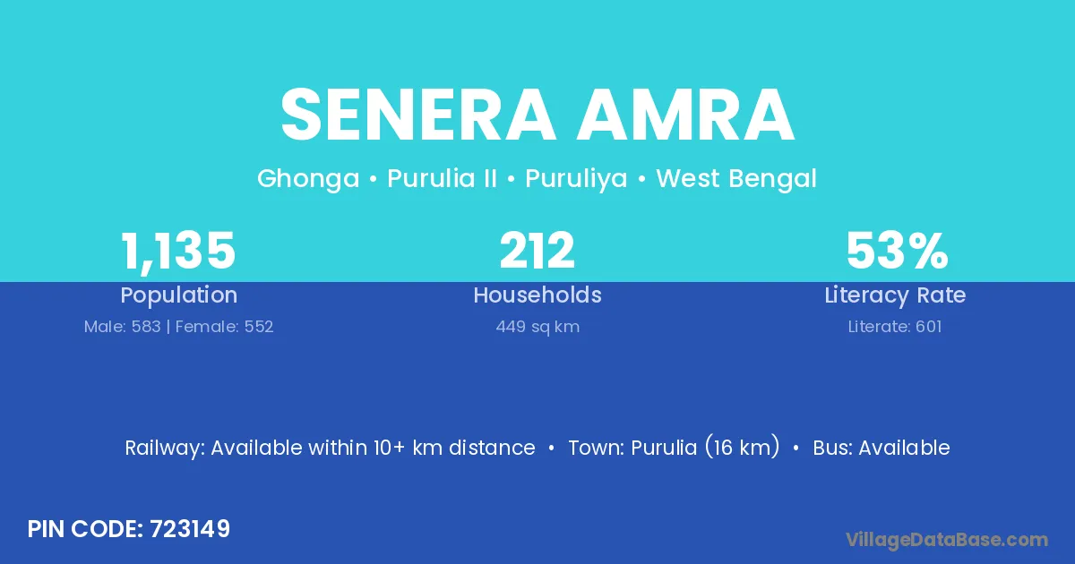 Purulia (16 km) is the nearest town to Senera Amra village for major economic activities and is located approximately 16 km away.