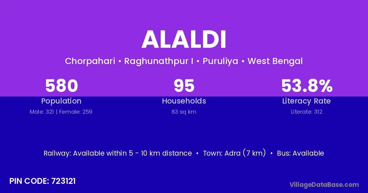 According to Census 2011 information, the village code of Alaldi village is 723121.