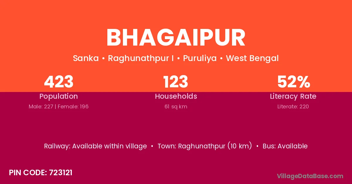 Raghunathpur (10 km) is the nearest town to Bhagaipur village for major economic activities and is located approximately 10 km away.