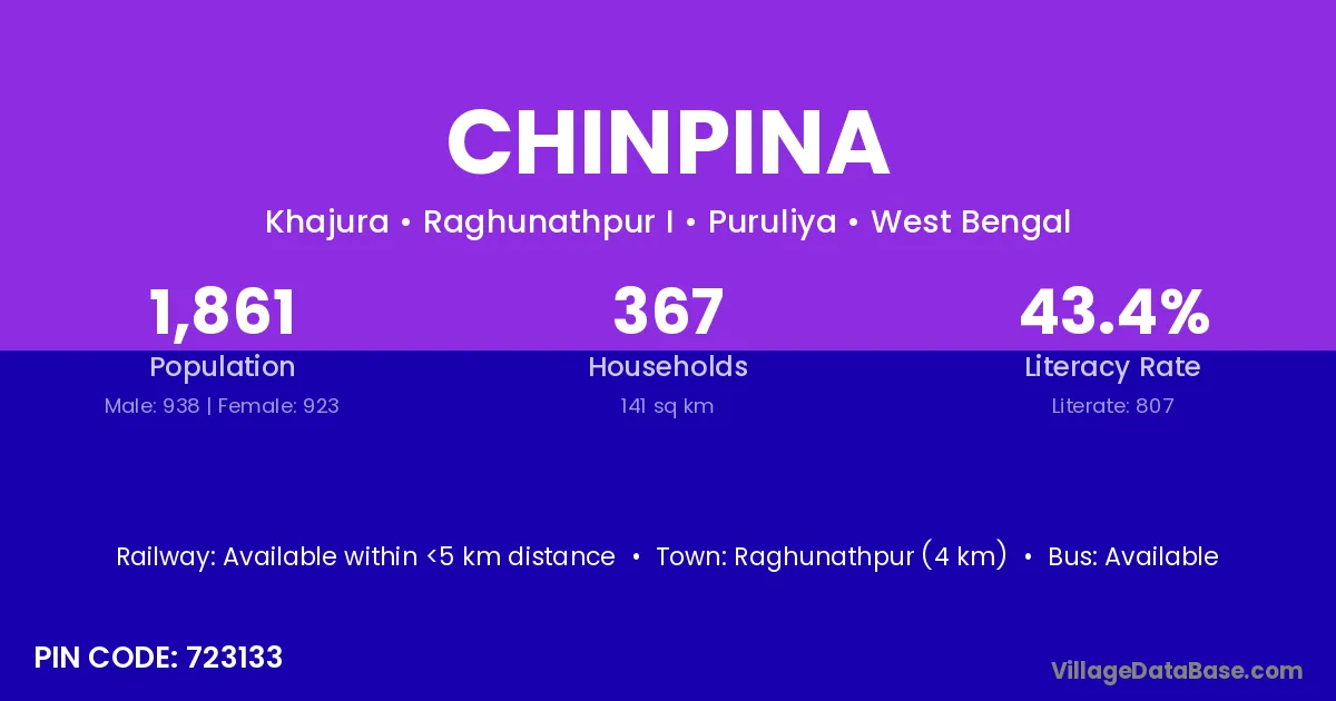 Raghunathpur (4 km) is the nearest town to Chinpina village for major economic activities and is located approximately 4 km away.
