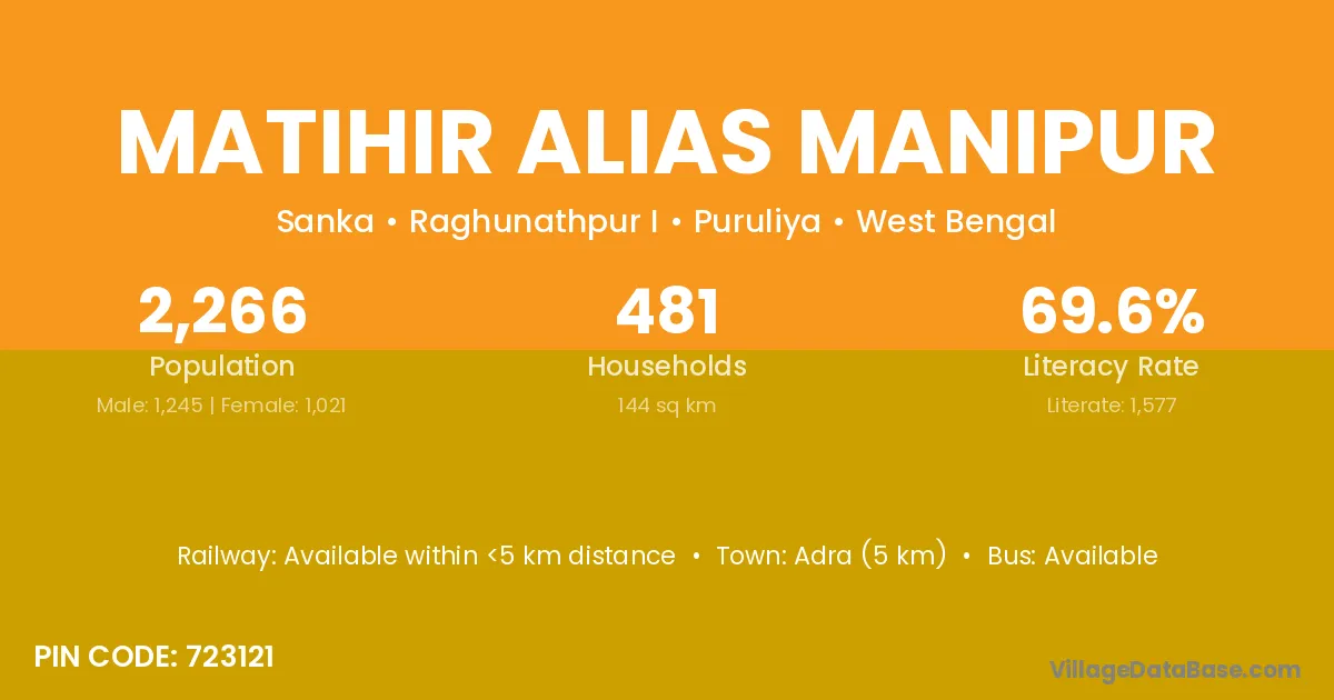 Matihir Alias Manipur village has a total population of 2,266 people, of which 1,245 are males and 1,021 are females.