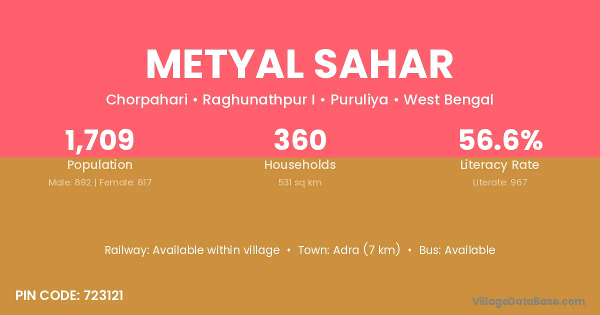 Metyal Sahar village is located in the Raghunathpur I Subdivision of the Puruliya district in West Bengal.