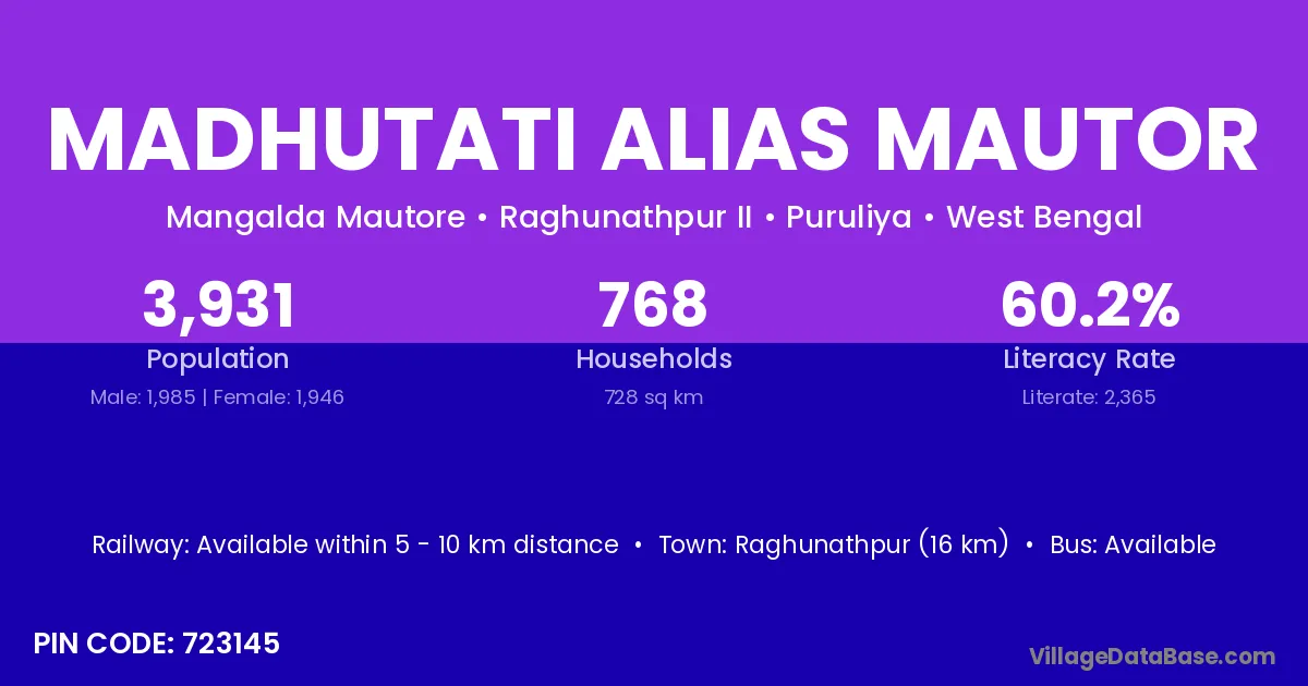 Madhutati Alias Mautor village has a total population of 3,931 people, of which 1,985 are males and 1,946 are females.