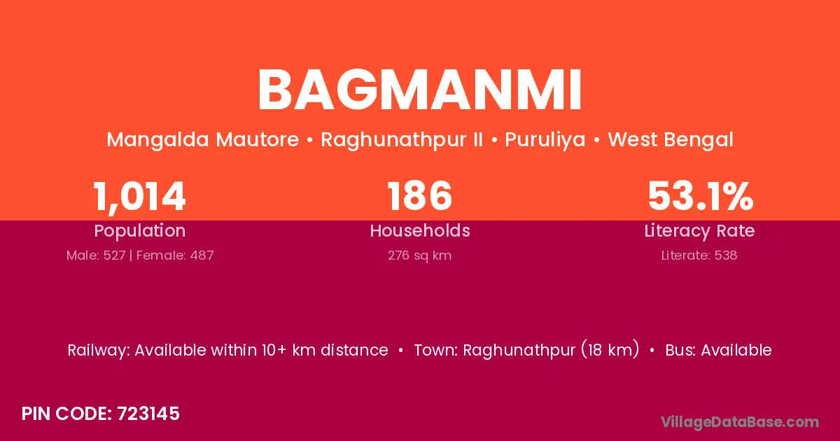 Raghunathpur (18 km) is the nearest town to Bagmanmi village for major economic activities and is located approximately 18 km away.
