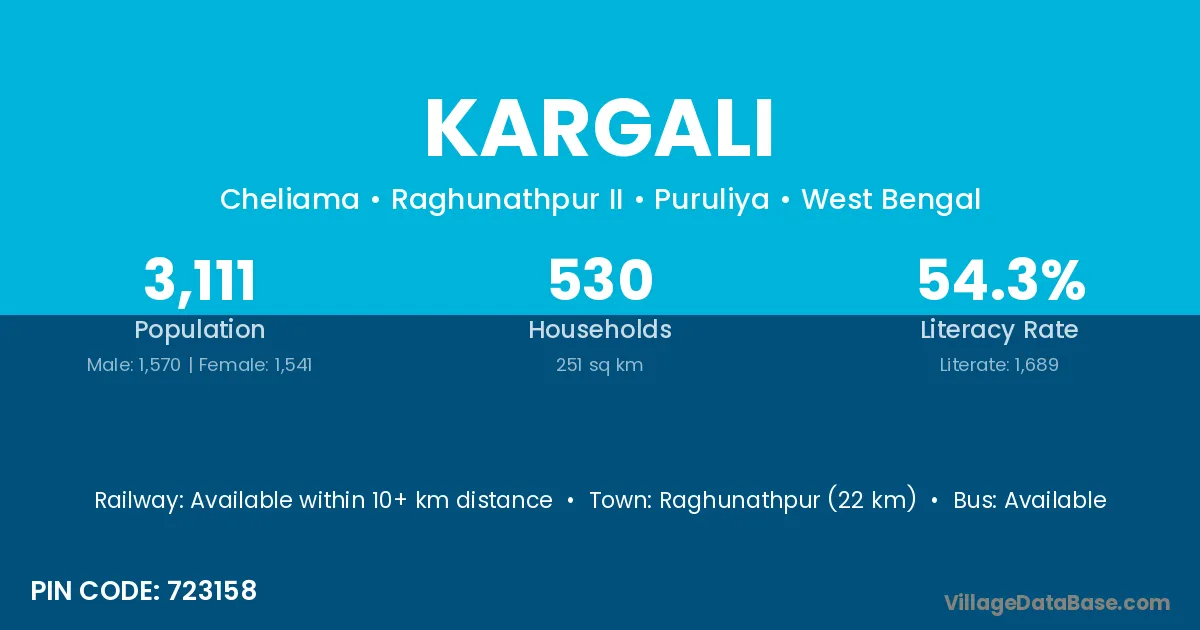 Raghunathpur (22 km) is the nearest town to Kargali village for major economic activities and is located approximately 22 km away.