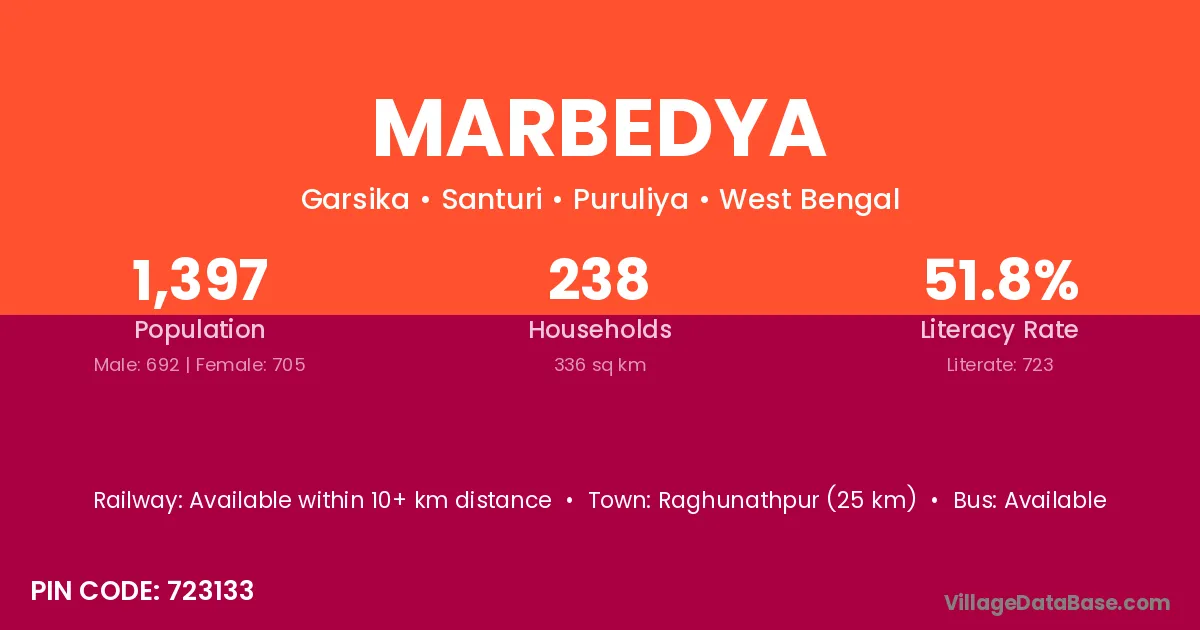 Raghunathpur (25 km) is the nearest town to Marbedya village for major economic activities and is located approximately 25 km away.