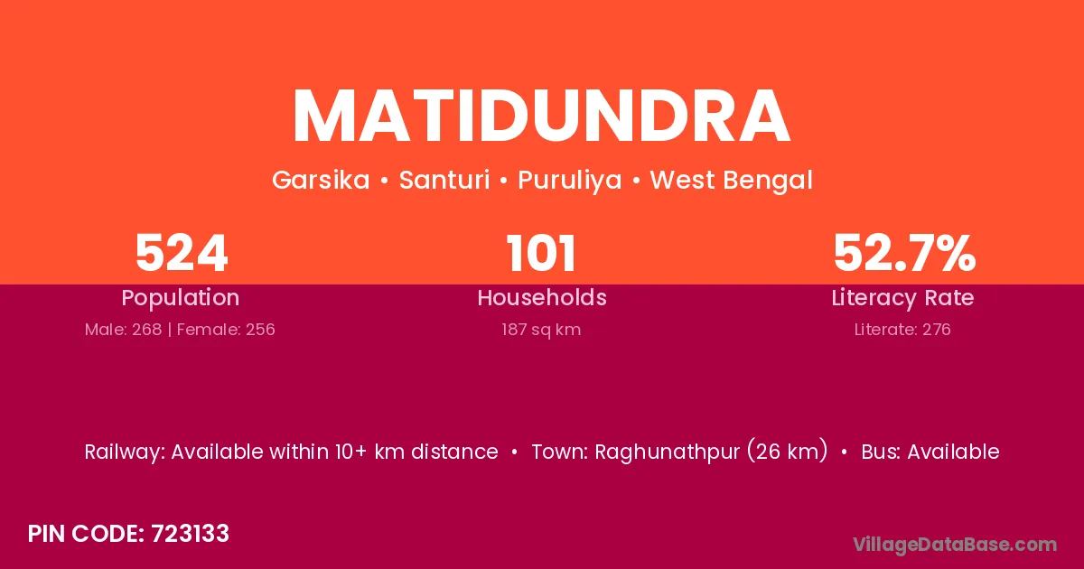 Raghunathpur (26 km) is the nearest town to Matidundra village for major economic activities and is located approximately 26 km away.