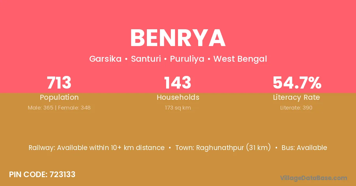 Raghunathpur (31 km) is the nearest town to Benrya village for major economic activities and is located approximately 31 km away.