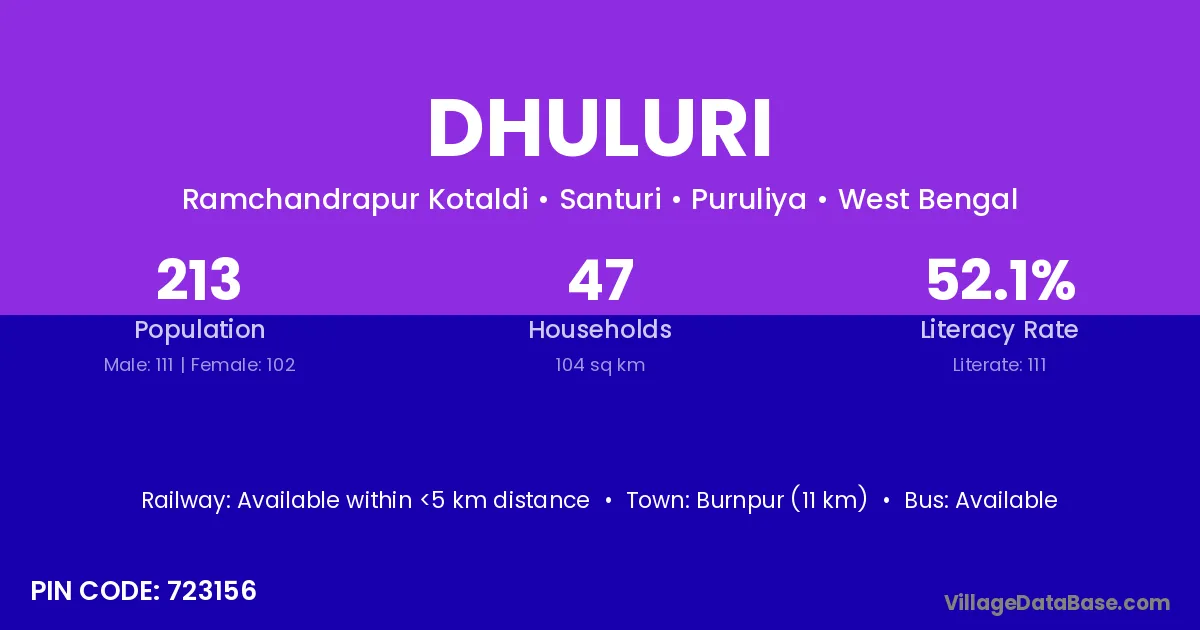 Burnpur (11 km) is the nearest town to Dhuluri village for major economic activities and is located approximately 11 km away.