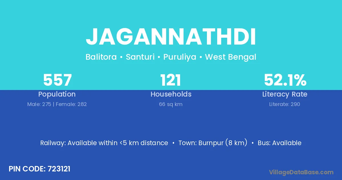 Burnpur (8 km) is the nearest town to Jagannathdi village for major economic activities and is located approximately 8 km away.
