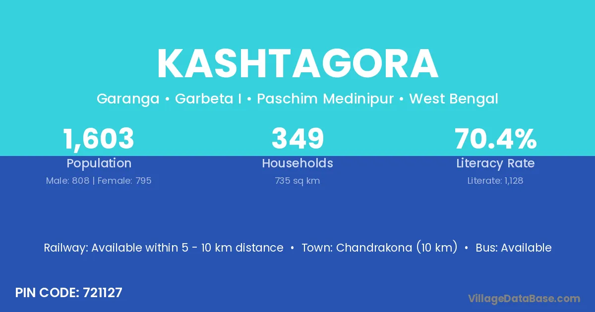 Burnpur (14 km) is the nearest town to Kashtagora village for major economic activities and is located approximately 14 km away.