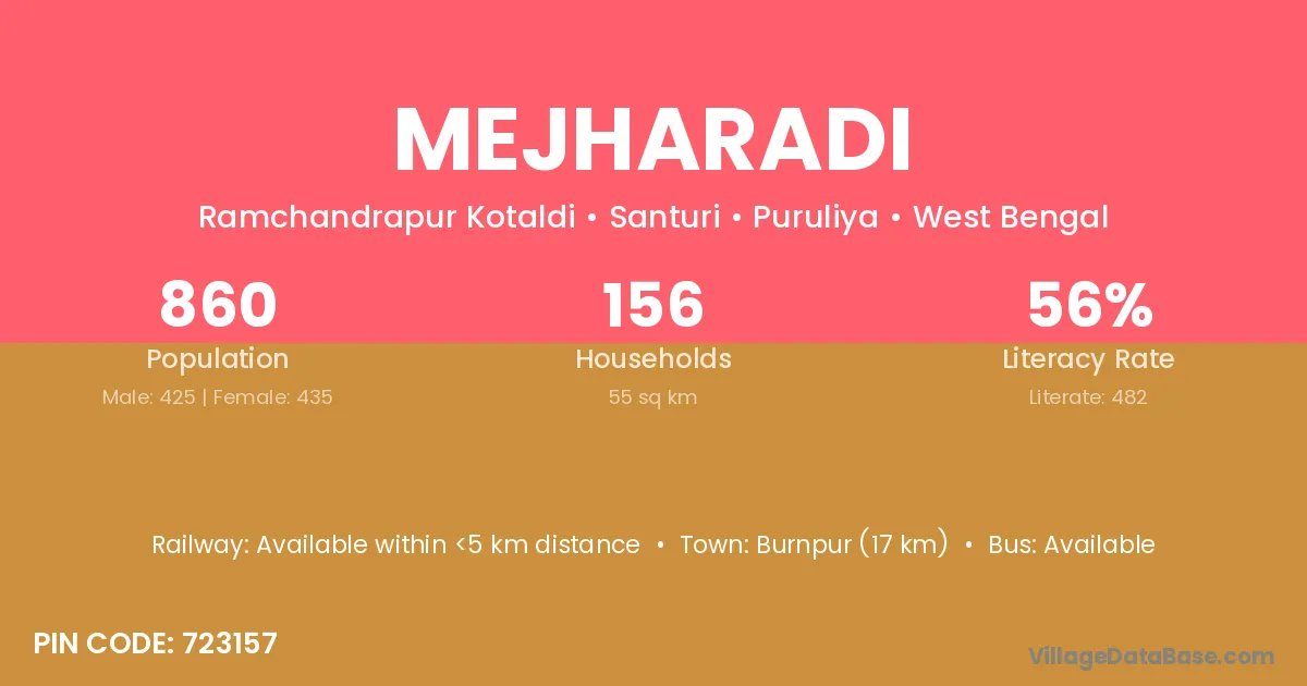 Burnpur (17 km) is the nearest town to Mejharadi village for major economic activities and is located approximately 17 km away.