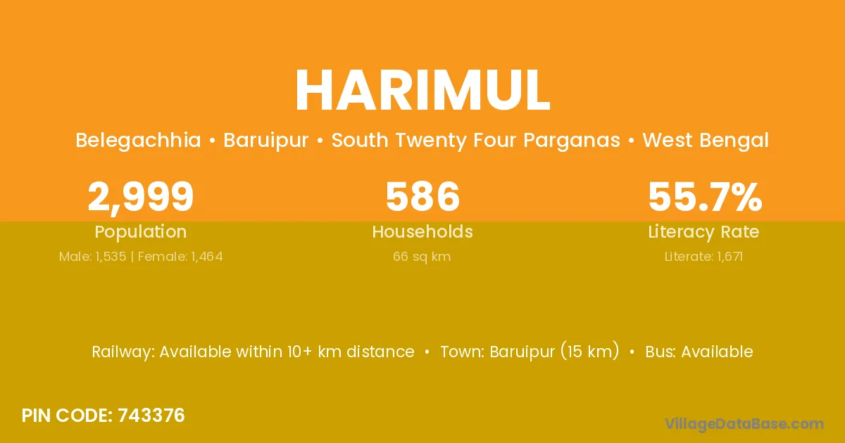 Baruipur (15 km) is the nearest town to Harimul village for major economic activities and is located approximately 15 km away.