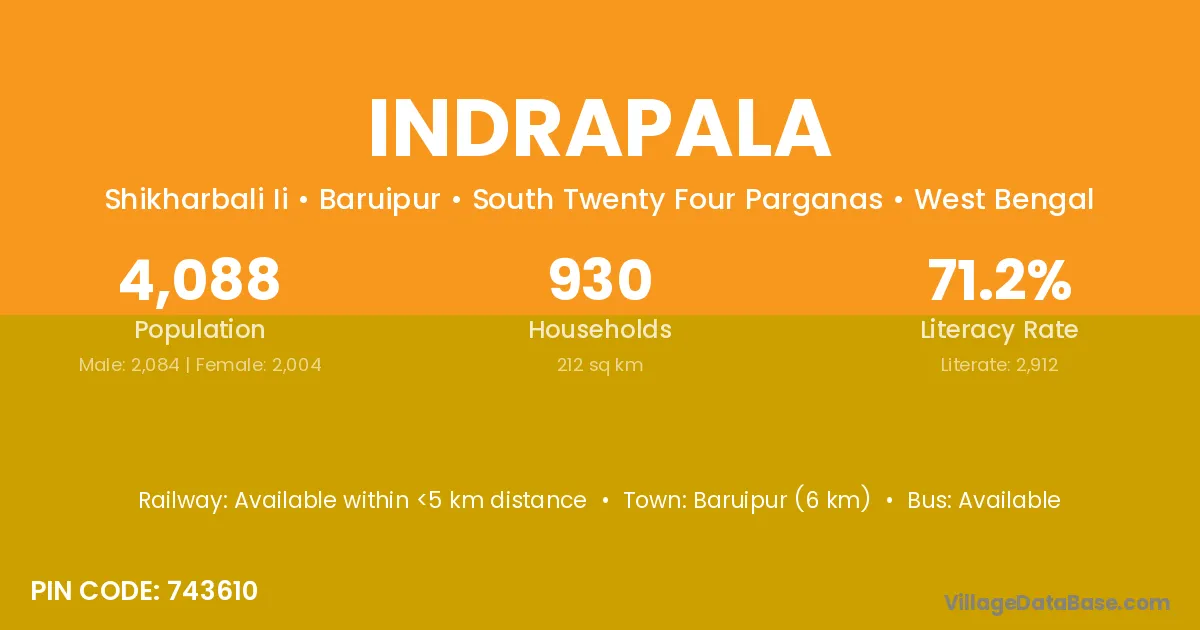 Baruipur (6 km) is the nearest town to Indrapala village for major economic activities and is located approximately 6 km away.
