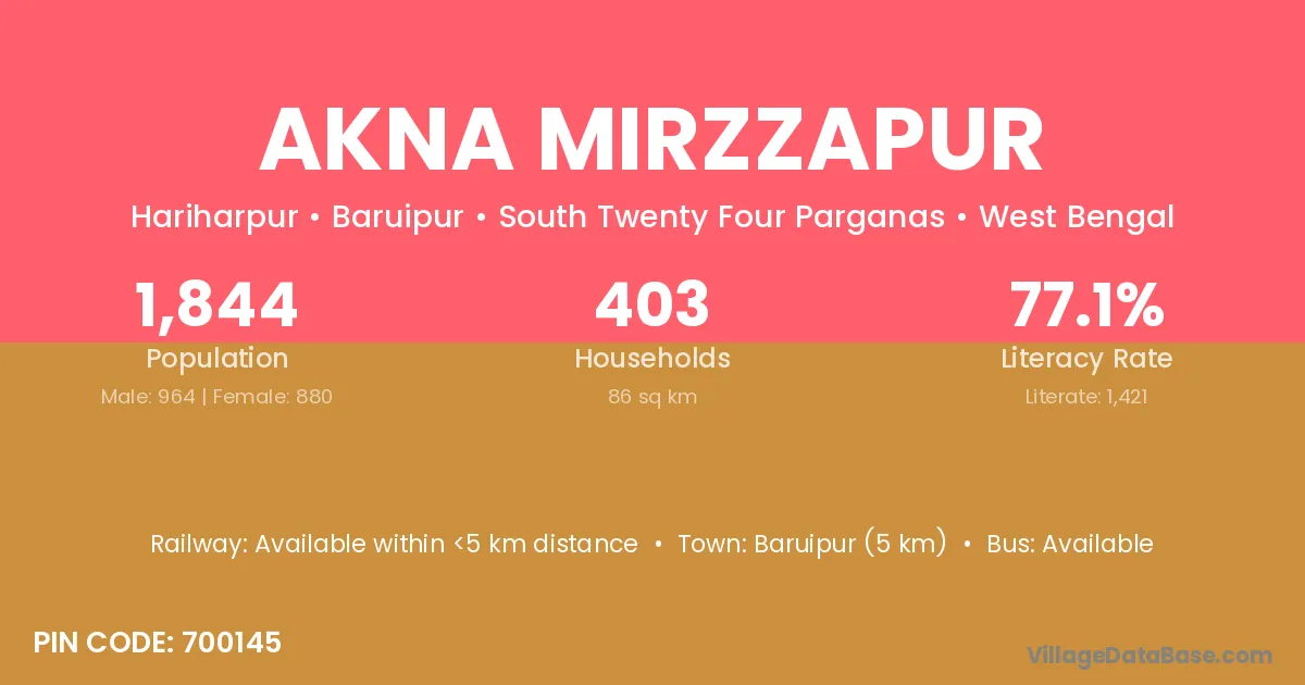 Baruipur (5 km) is the nearest town to Akna Mirzzapur village for major economic activities and is located approximately 5 km away.