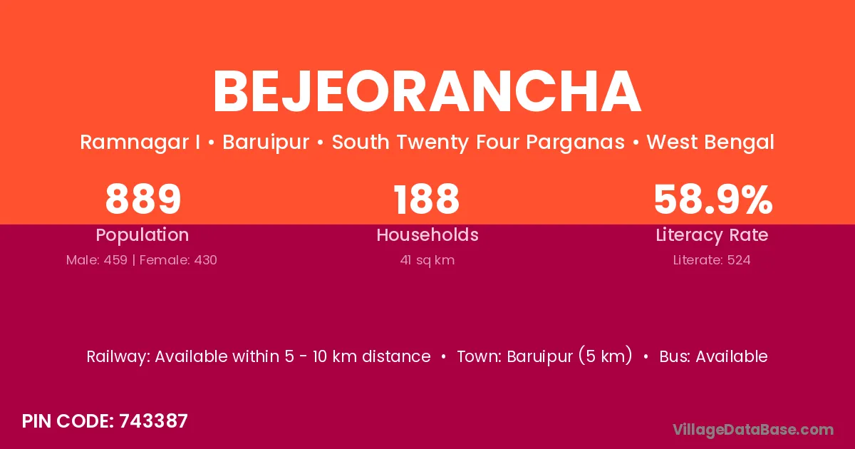 Baruipur (5 km) is the nearest town to Bejeorancha village for major economic activities and is located approximately 5 km away.