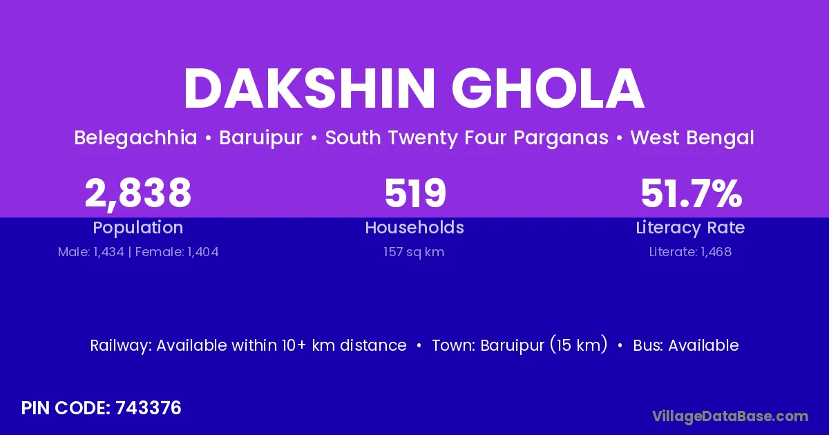 Baruipur (15 km) is the nearest town to Dakshin Ghola village for major economic activities and is located approximately 15 km away.