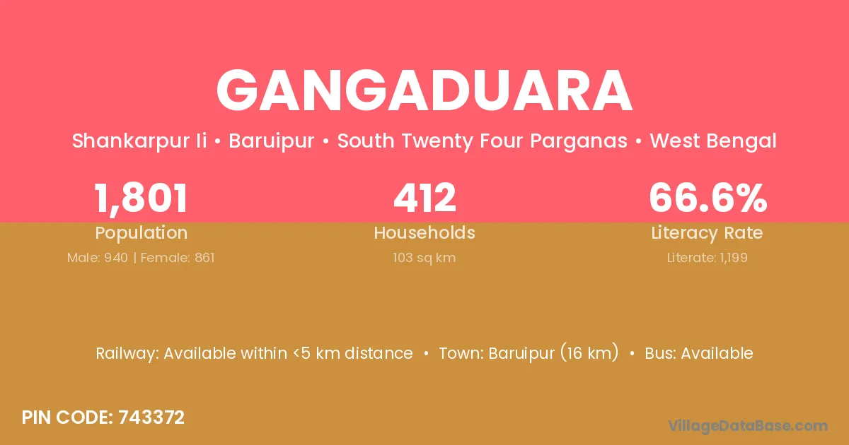 Baruipur (16 km) is the nearest town to Gangaduara village for major economic activities and is located approximately 16 km away.