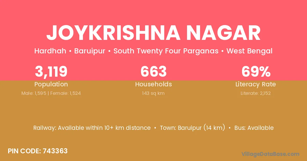 Baruipur (14 km) is the nearest town to Joykrishna Nagar village for major economic activities and is located approximately 14 km away.