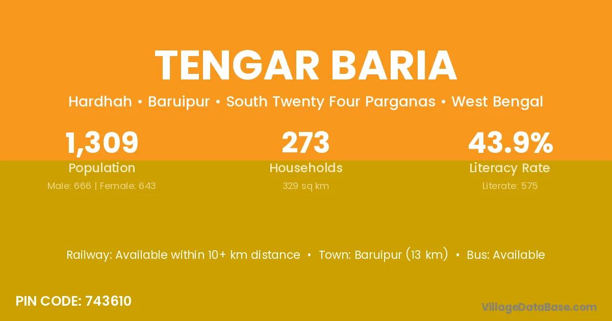Baruipur (13 km) is the nearest town to Tengar Baria village for major economic activities and is located approximately 13 km away.