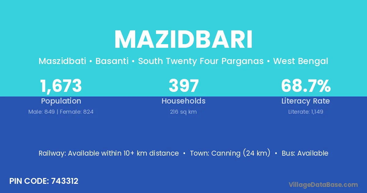 Canning (24 km) is the nearest town to Mazidbari village for major economic activities and is located approximately 24 km away.
