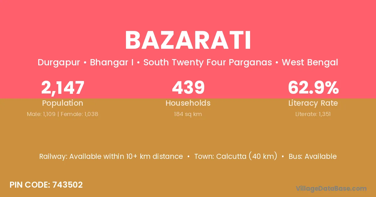 Calcutta (40 km) is the nearest town to Bazarati village for major economic activities and is located approximately 40 km away.