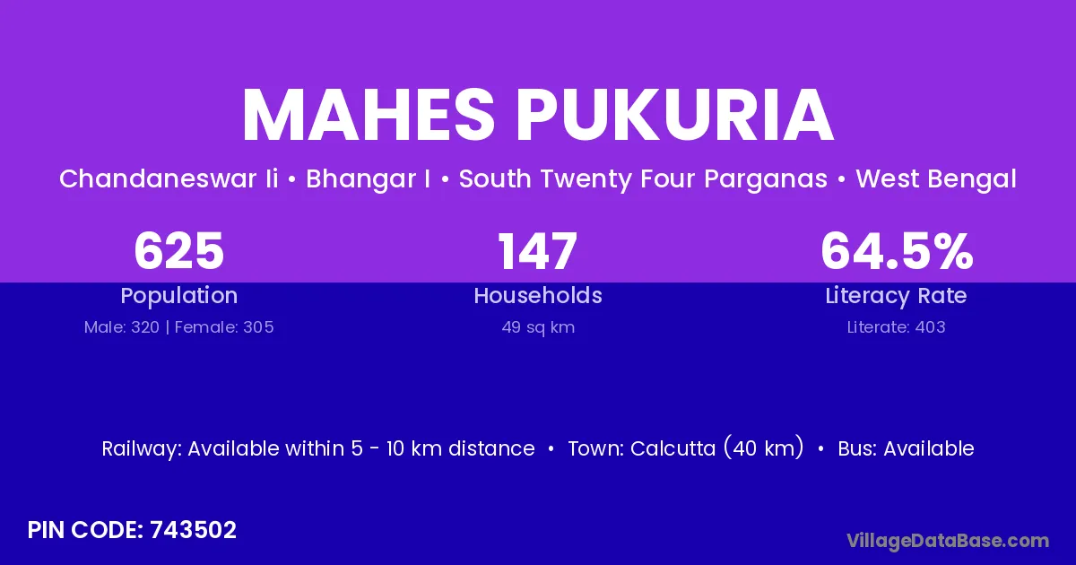 Calcutta (40 km) is the nearest town to Mahes Pukuria village for major economic activities and is located approximately 40 km away.
