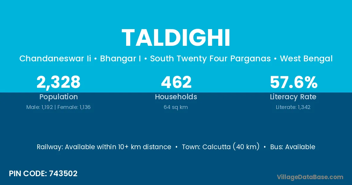 Calcutta (40 km) is the nearest town to Taldighi village for major economic activities and is located approximately 40 km away.