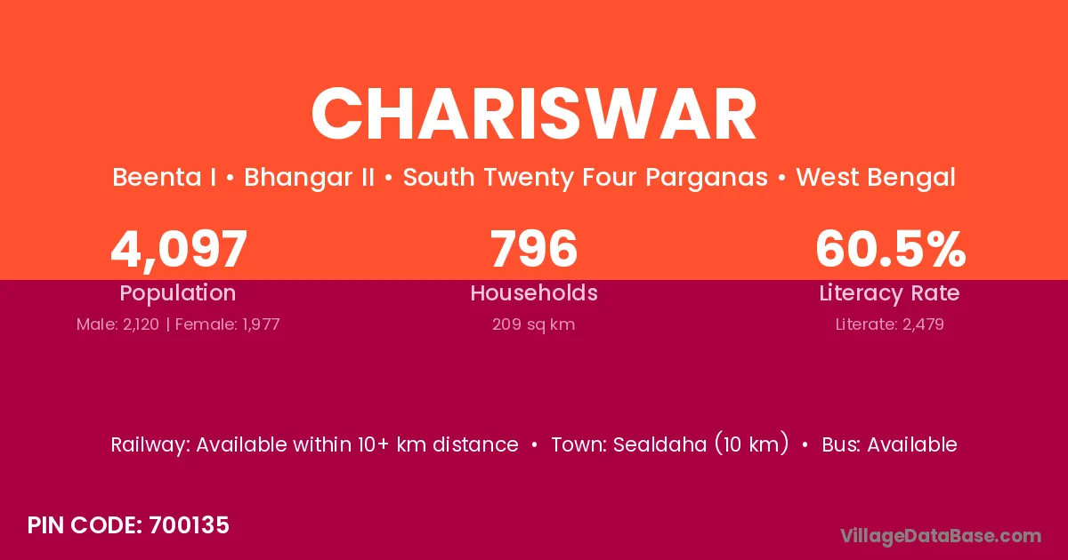 Chariswar village is located in the Bhangar II Subdivision of the South Twenty Four Parganas district in West Bengal.