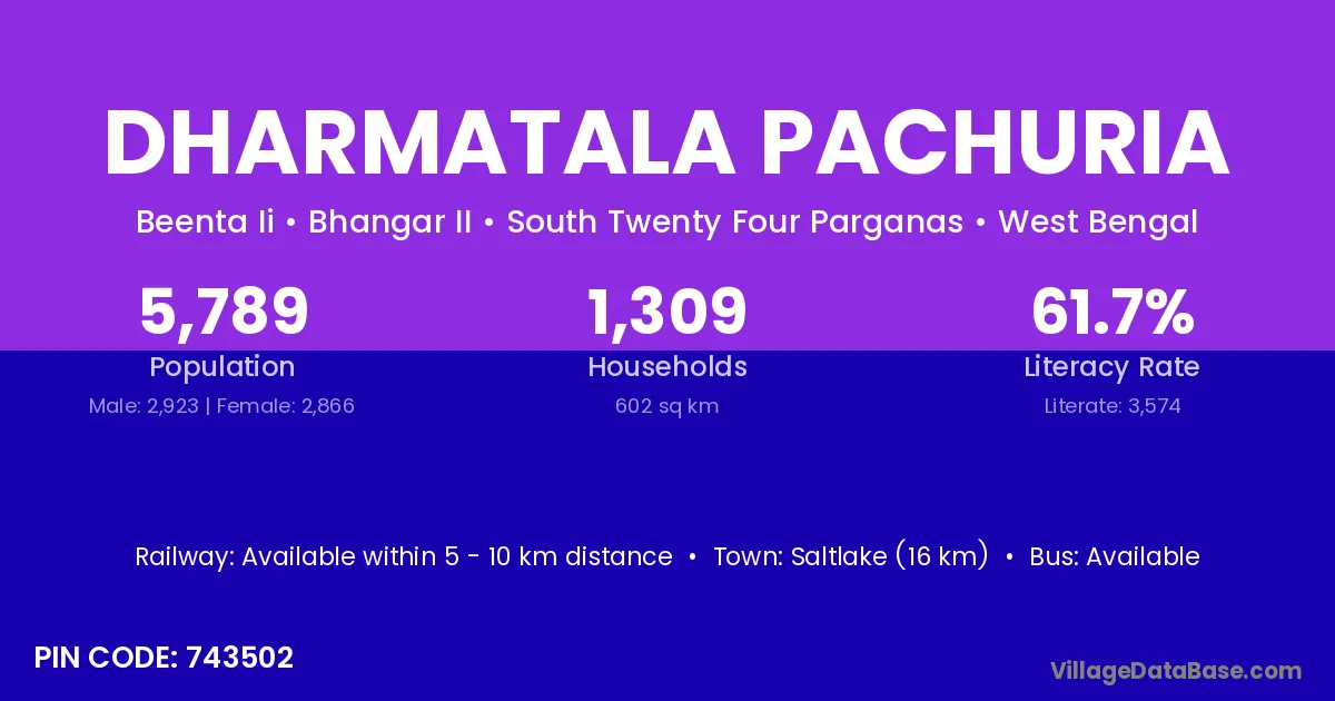 Dharmatala Pachuria village has a total population of 5,789 people, of which 2,923 are males and 2,866 are females.