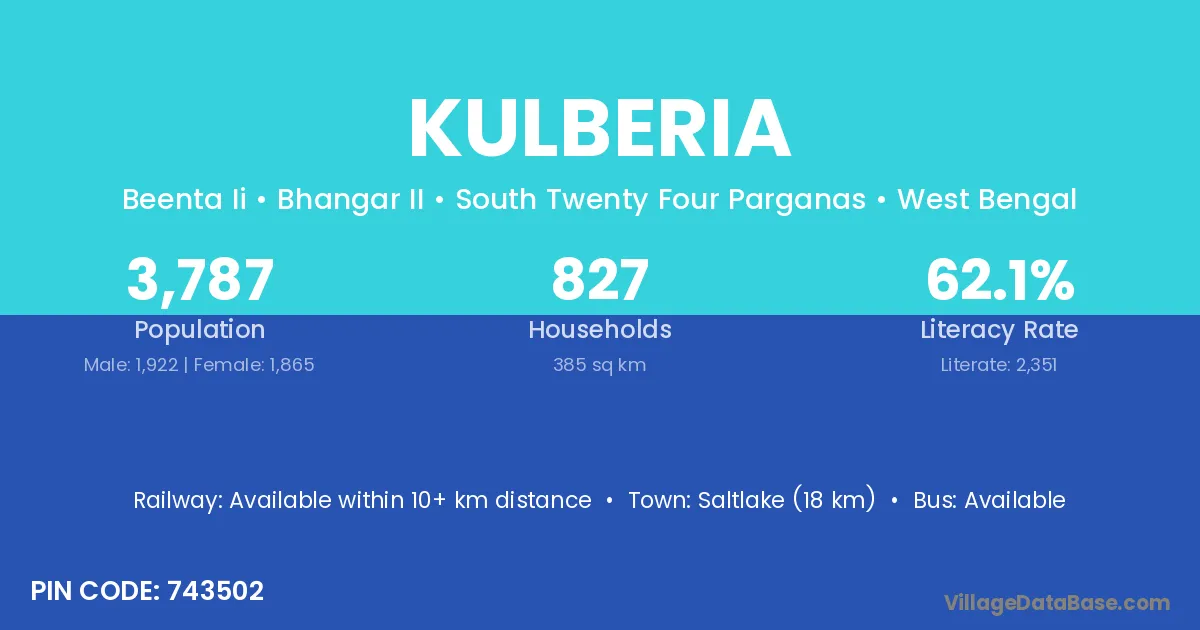 Saltlake (18 km) is the nearest town to Kulberia village for major economic activities and is located approximately 18 km away.