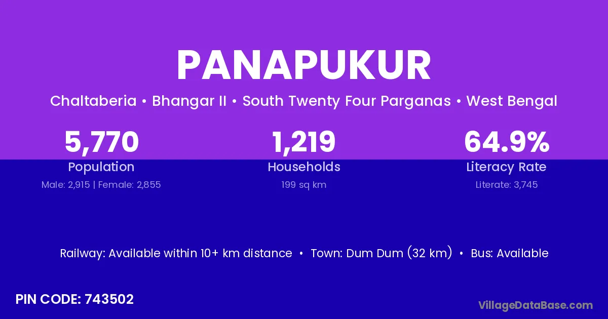 Dum Dum (32 km) is the nearest town to Panapukur village for major economic activities and is located approximately 32 km away.