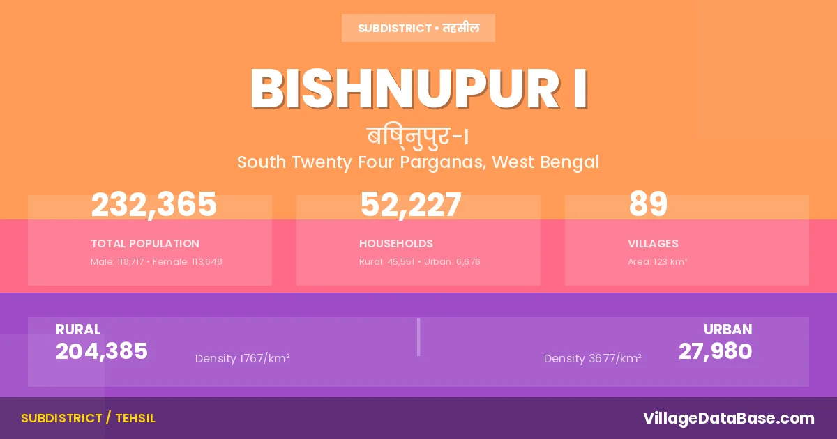 According to the 2011 census The total area of Bishnupur I Subdivision is 123 km², with a population of 232365 people. The population density is 1,885 inhabitants per square kilometre, and there are approximately 52227 houses in the sub district.