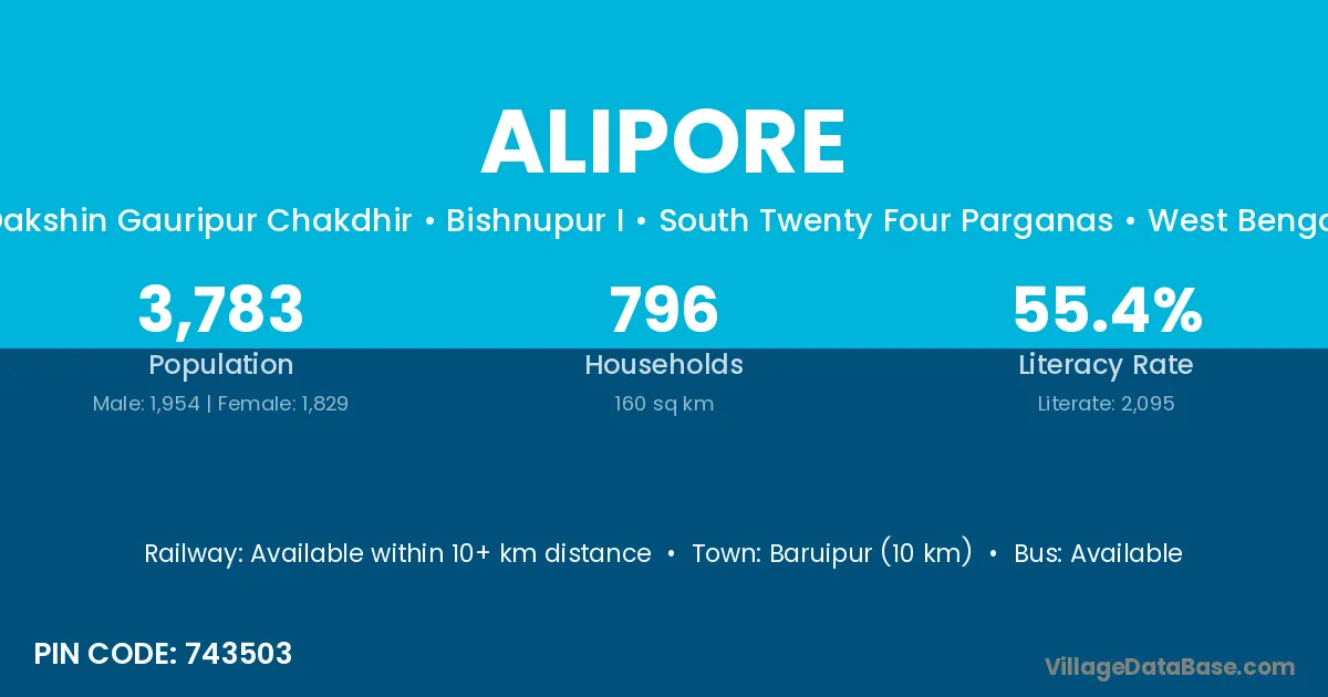 Baruipur (10 km) is the nearest town to Alipore village for major economic activities and is located approximately 10 km away.