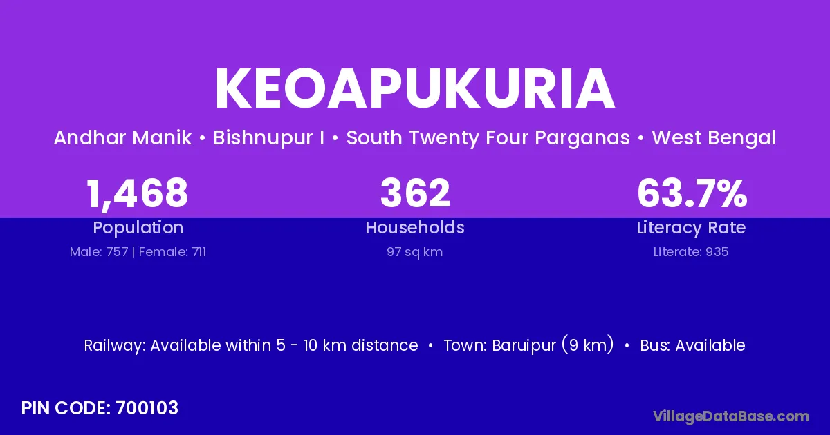 Baruipur (9 km) is the nearest town to Keoapukuria village for major economic activities and is located approximately 9 km away.