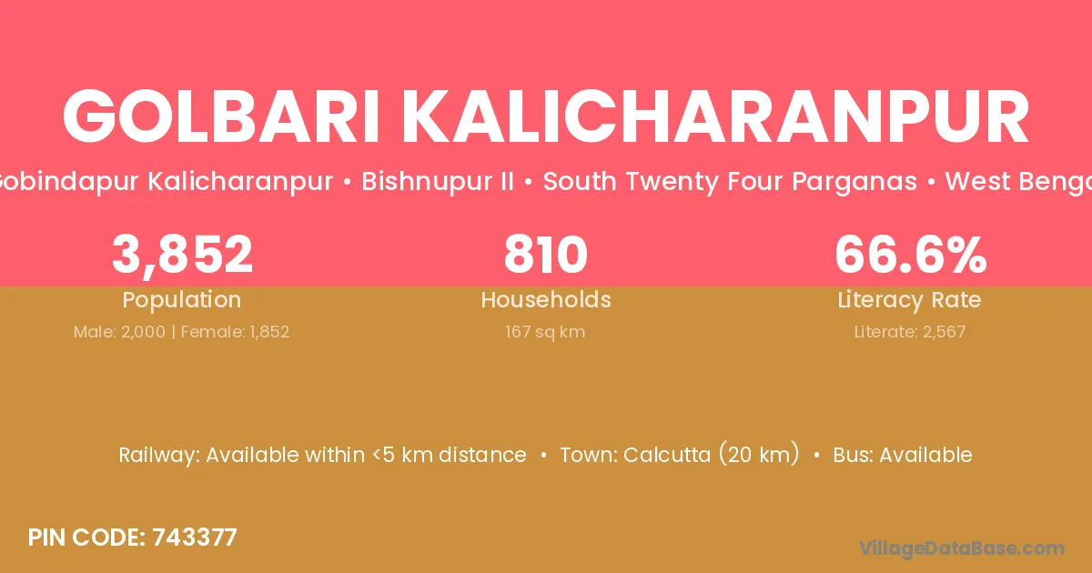 Calcutta (20 km) is the nearest town to Golbari Kalicharanpur village for major economic activities and is located approximately 20 km away.