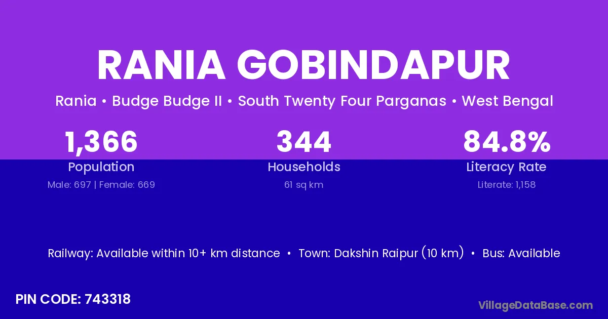 According to Census 2011 information, the village code of Rania Gobindapur village is 743318.