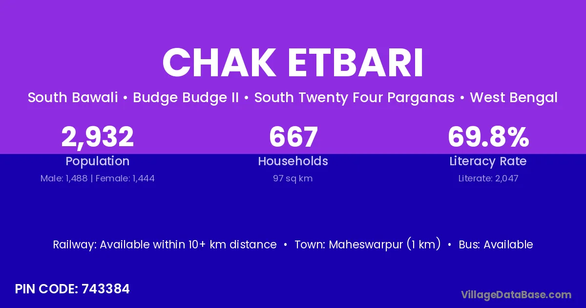 Maheswarpur (1 km) is the nearest town to Chak Etbari village for major economic activities and is located approximately 1 km away.